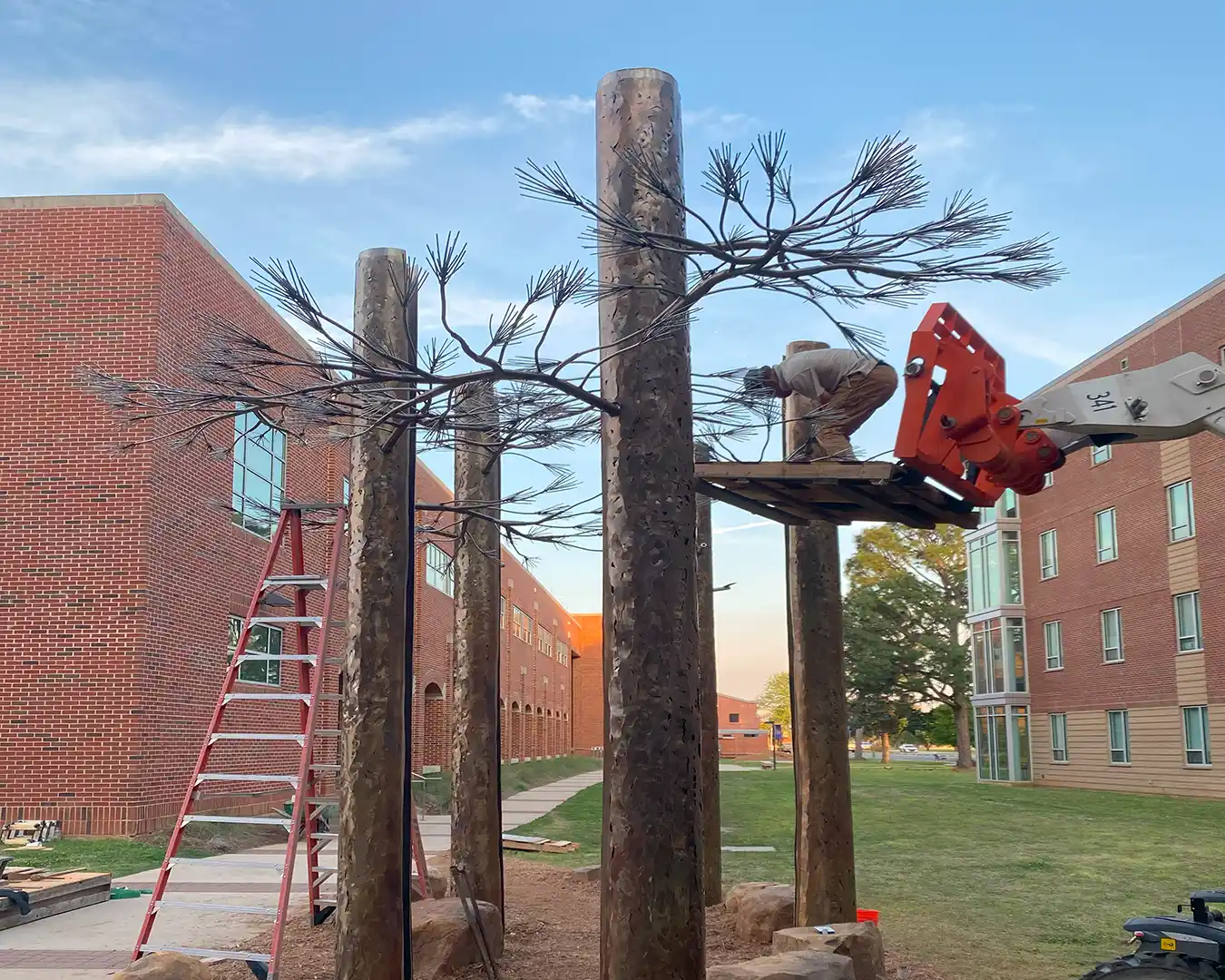 This project called for more than materials, it demanded meaning. The Carolin Dormand Memorial at NSU honors the life and legacy of a beloved figure, with a serene space that invites quiet reflection. We provided custom-cut stone elements that echo the surrounding landscape while creating a powerful visual presence. The trees illuminated by uplighting and the careful placement of stone create a sense of reverence and calm proof that nature and memory can coexist beautifully.